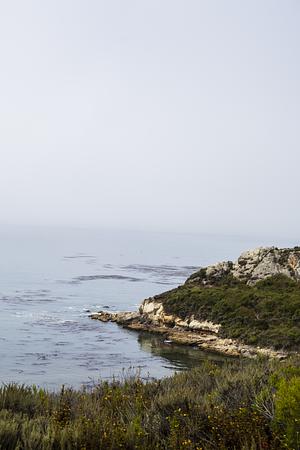 This image captures the tranquil beauty of a Central Coast cliffside. The rugged cliffs are covered in lush green vegetation, contrasting with the calm, expansive ocean stretching out to the horizon. The serene waters, dotted with patches of seaweed, reflect the muted sky above, creating a peaceful and harmonious scene. The coastal cliff and its surroundings offer a glimpse into the untouched natural beauty of the region.