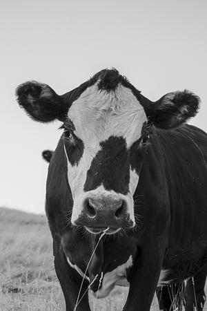 This striking black-and-white photograph captures the gentle gaze of a cow, framed perfectly against the backdrop of a grassy field. The simplicity of the composition highlights the serene presence of the animal, making it a timeless piece that brings a touch of rural tranquility to any space. Ideal for those who appreciate the quiet beauty of farm life.